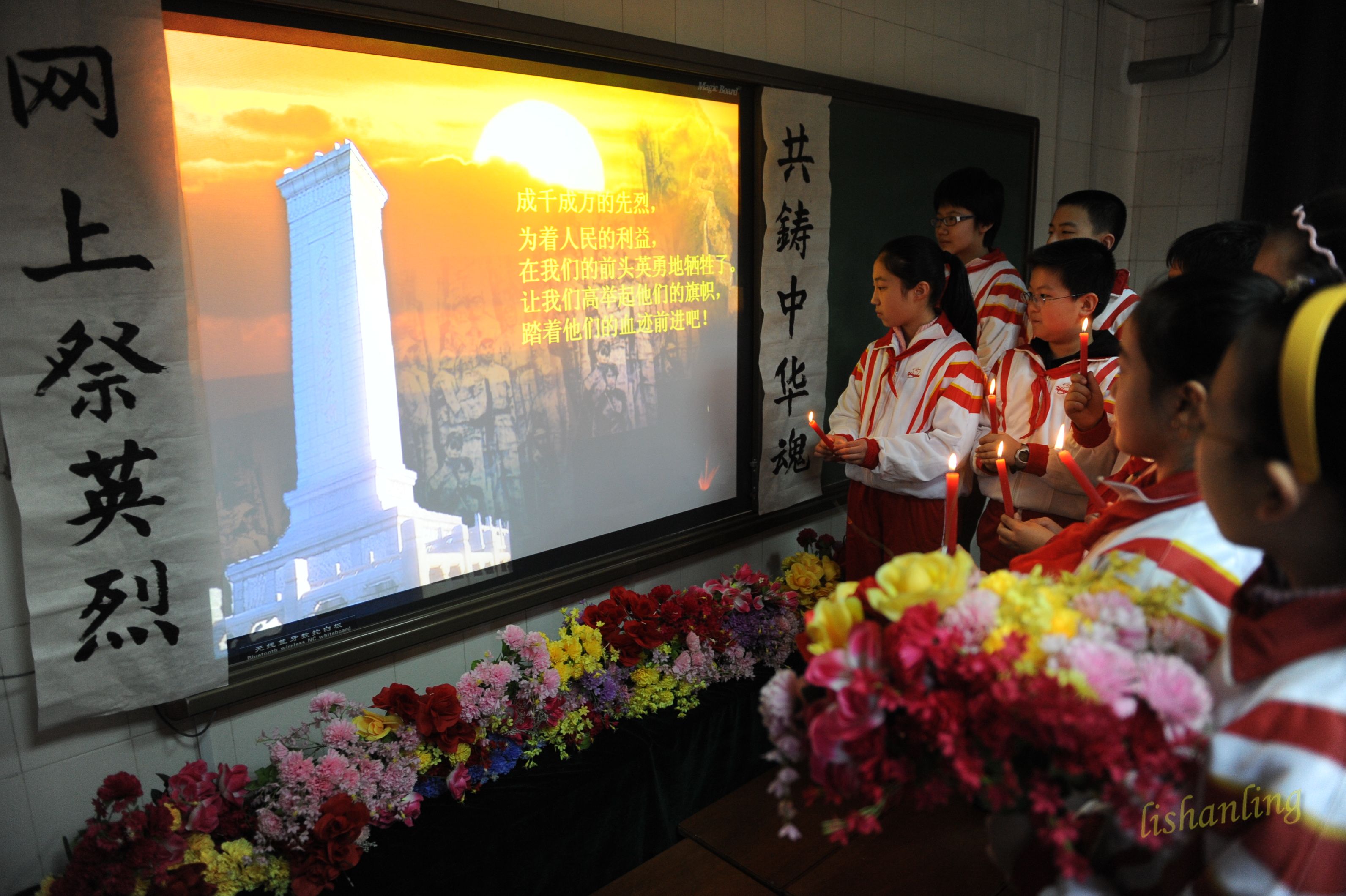 同学分批到机房后,按次序坐好,打开网站把白花系在屏幕上。在主持人的主持下起立默哀三分钟,主持人读悼词。默哀完毕后同学们各自观看网站上烈士们的先进事迹,在网站上选择自己认为合适的花献给烈士们,并留下自己最真心最想对烈士们说的话。也许这样的留言并不能把同学们心中想说的都表达出来,但至少都表达了大家对烈士们的敬意,表达了一颗颗年轻的心对祖国的热爱。