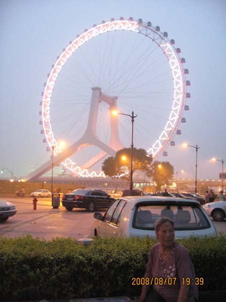 永乐桥又名“天空之眼”,位于天津著名的三岔河口上方,是连接天津北部与南部的重要交通枢纽,它长330米,跨度100米,分为上下两层,上层是机动车道,下层是人行道。称它为“天空之眼”,原因是它是世界上独一无二的设立在桥上的摩天轮,摩天轮轮盘外挂有48个透明座舱,坐在最高处,你可以看到方圆40公里以内的景色,不管你身处河北区、红桥区、和平区还是南开区,你都能看到这座耀眼的摩天轮。每当黄昏之后,站在市区的海河边,一个挂在天空的巨大“花环”就会映入你的眼帘,它时而变成红色,时而变成蓝色,一会儿像一条彩龙在摩天轮盘上蜿蜒游动,一会儿又像黑暗天空中怒放的大花。五彩的灯光倒映在河水里,河水倒映着五彩斑斓的灯光,真是交相呼应,是那么的美丽,那么的迷人。