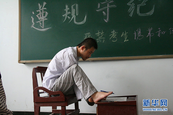 当日是2010年全国高考第一天,河北省邯郸市磁县第一中学无臂考生索鹏飞,用脚答出了高考试卷。索鹏飞从小失去双臂,平日用脚吃饭、穿衣、写字,凭借坚强的毅力坚持读书学习,并报名参加高考。新华社发(王九忠摄)
